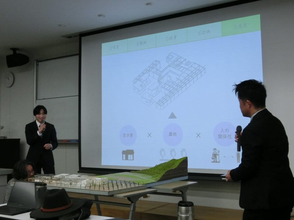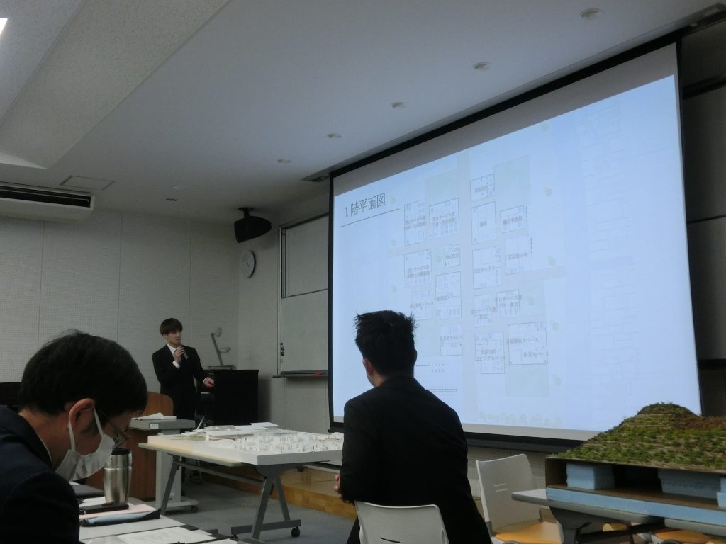 当日は、各学生が口頭発表形式で設計内容を発表し、設計の背景やコンセプト、敷地条件、空間構成などについて説明を行いました。スライドに加え、模型を用いて空間構成や設計意図を示すことで、より具体的な説明がなされました。