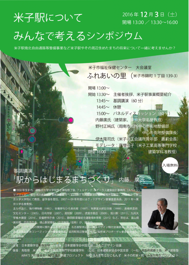 現在、米子駅南北自由通路等事業が進んでいますが、そのことについて駅や周辺まちづくりのことも含めて一緒に考えるシンポジウムが開かれます。基調講演には魅力的な駅舎の設計や駅関連の委員会委員長を歴任され……
