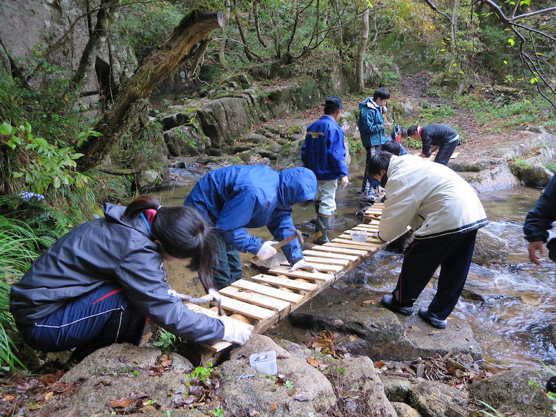 2016年11月6日、日南町で民泊を営んでおられる 「古民家かつみや」さんでの地域活動の一環として、 聖滝の桟橋を手作りで作成しました。 小椋研・金澤研・細田研の3研究室の4年5年生……
